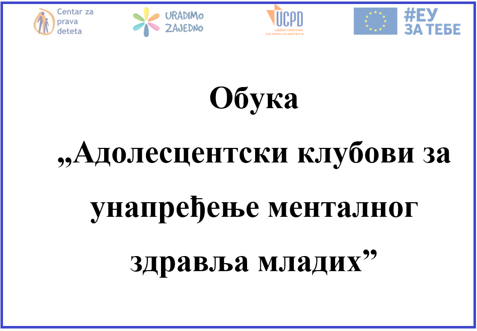 У Регионалном центру за професионални развој запослених у образовању у Ужицу, 18. и 19. априла 2026. године, одржана је дводневна обука „Адолесцентски клубови за унапређење менталног здравља младих“, која је окупила средњошколце из Ужица са заједничким циљем – да отворено говоре о менталном здрављу и покрену иницијативе које ће допринети бољој подршци младима у њиховој заједници.
